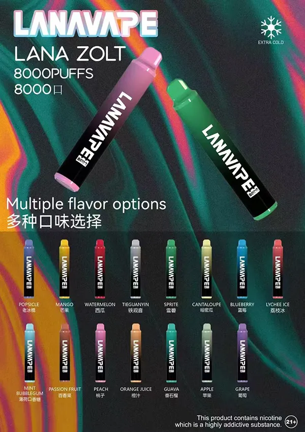 LANA ZOLT 20種口味 一次性電子煙 8000口大容量 可充電,以其超大容量和長續航能力,一次性電子菸線上購買,成為菸民的理想選擇。每支電子菸搭載15ml大容量煙油倉和850mAh強勁電池,提供長達8000口的持久續航,確保您隨時隨地享受優質的電子煙體驗。